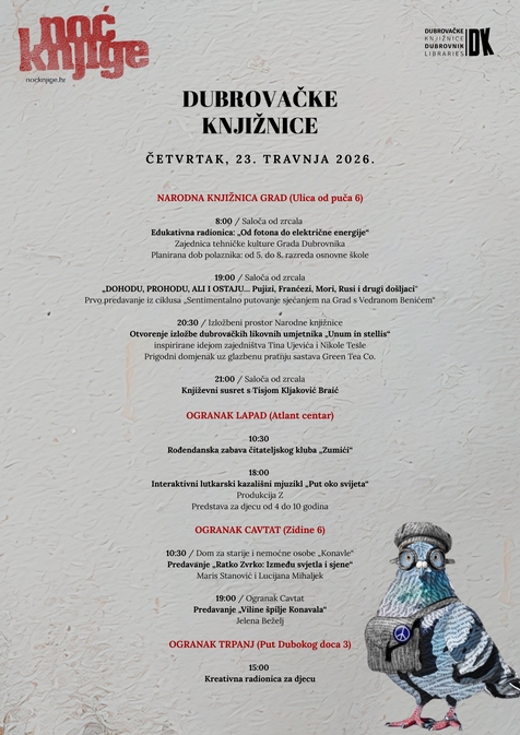 Dubrovačke knjižnice s ograncima i ove će godine svojim programskim aktivnostima 23. travnja obilježiti Noć knjige, manifestaciju koja već 15. godinu zaredom povodom Dana hrvatske knjige (22. travnja) i Svjetskog dana knjige i autorskih prava (23. travnja) potiče kulturu čitanja i uvažavanja knjige.