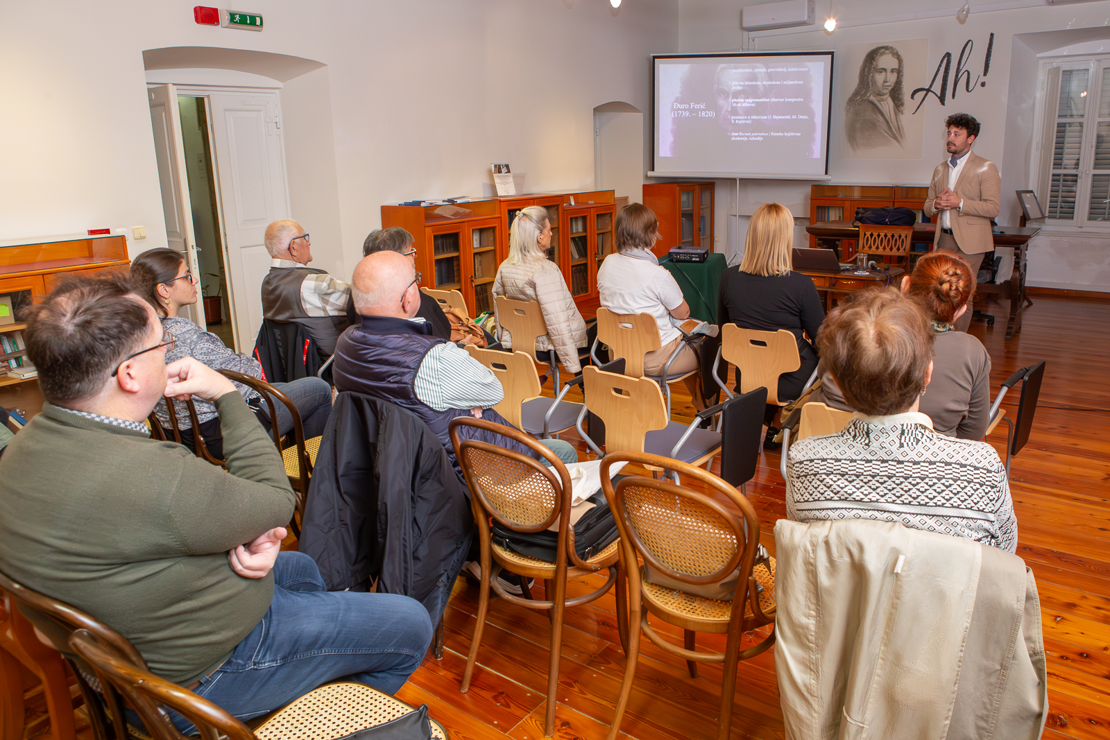 Okupljene je uvodno pozdravila voditeljica Znanstvene knjižnice Paula Raguž. Đuro Ferić (1739.-1820.) bio je hrvatski književnik, plodan latinski pjesnik, ali i oduševljen štovatelj narodne poezije, poliglot, izrastao na zasadama triju epoha. Vremenski pripada razdoblju klasicizma, jezično i žanrovski nadahnut je antikom, dok je tematskim interesima blizak europskom predromantizmu. Njegovo oduševljenje za narodnu riječ jasno zrcali probuđenu nacionalnu svijest.