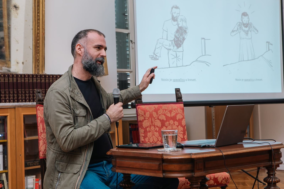 Govoreći o čestim jezičnim pogreškama, Sršen je pokazao i jednu vlastitu pogrešku koja je nastala prilikom prijevoda stranog stripa. „Svi ponekad griješimo. Važno je ne biti prestrog, ali je važno i poštovati hrvatski standardni jezik“, poručio je Sršen.