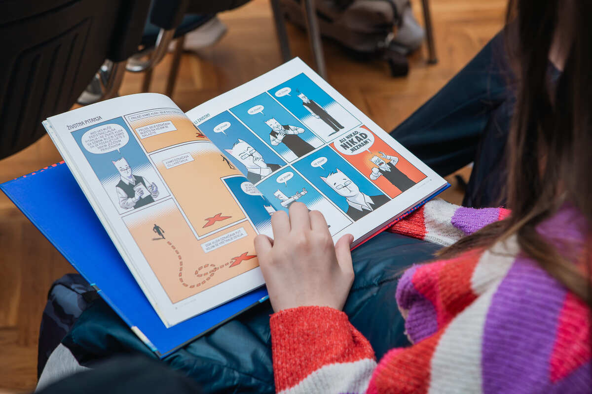 Tijekom predstavljanja Sršen je s učenicima razgovarao o važnosti poznavanja standardnoga jezika, posebno u javnoj komunikaciji i medijima. Kroz primjere iz stripa pokazao je kako mala razlika u pisanju – poput dijakritičkih znakova ili točke iza broja – može potpuno promijeniti značenje riječi. Učenici su pritom aktivno sudjelovali u razgovoru te pokušavali prepoznati pogreške iz svakodnevnih primjera koje autor bilježi i pretvara u stripovske epizode.