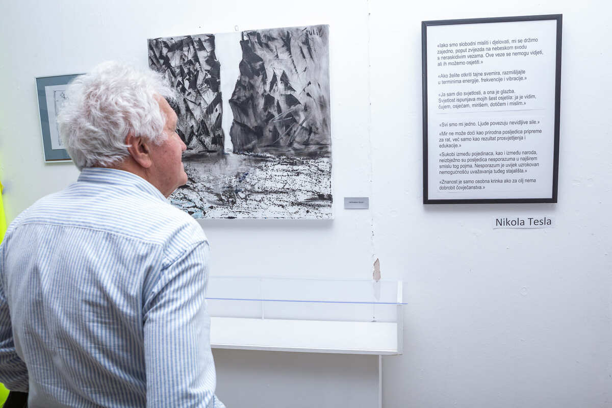 Izložba okuplja suvremene dubrovačke umjetnike koji kroz različite likovne tehnike interpretiraju ideju kozmičkog zajedništva, povezanosti svega postojećeg te istražuju nevidljive niti između pojedinca, drugih i beskraja. U središtu postava nalazi se promišljanje čovjeka kao dijela šire cjeline – iste one misli koju su, svaki na svoj način, artikulirali 𝐔𝐣𝐞𝐯𝐢ć u poeziji i 𝐓𝐞𝐬𝐥𝐚 u znanstvenoj viziji svijeta.